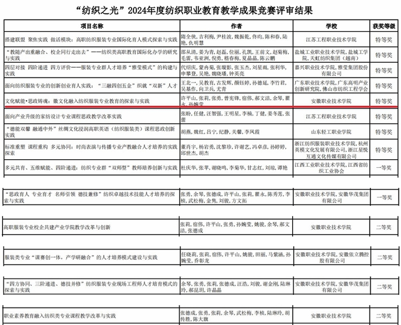 “纺织之光”教学成果奖主要面向纺织行业院校,每两年评审一次,以展示我国纺织服装职业教育领域取得的优秀成果,鼓励教师积极开展教育教学研究和实践活动,共同促进教育服务纺织工业发展的能力。据悉,今年的纺织职业教育教学成果奖经初评、网络评审和会议评审,共产生特等奖22项,一等奖60项,二等奖137项。