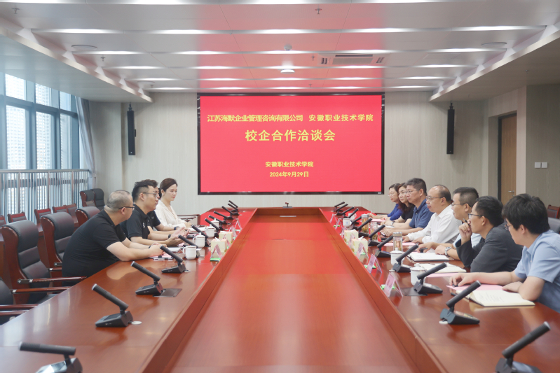李方泽代表学院对张越一行来院洽谈表示欢迎,并简要介绍了学院办学历史和当前发展态势。他表示,学院办学始于1954年创办的“安徽纺织技训班”,源头彰显了工业报国的志向,也先天造就了产教融合、校企合作的现代职教办学特质。一直以来,特别是近年来,学院秉持开放办学,与省内所有地市、安徽十大战略新兴产业中的头部企业都建立了战略合作关系。他希望江苏海默企业管理咨询有限公司与学院共同用心、用情,做细、做实产教融合、校企合作,以高水平合作,服务双方高质量发展。