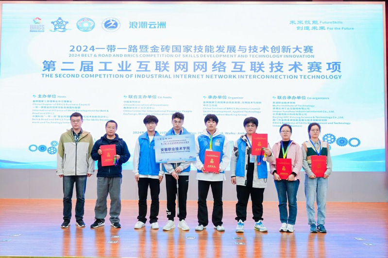 本网讯(计算机与信息技术学院)11月9日,2024“一带一路”暨金砖国家技能发展与技术创新大赛之工业互联网网络互联技术赛项国内赛决赛在芜湖职业技术学院隆重举行,吸引了全国111支精英队伍参与角逐。大赛设置了学生组和教师组两个组别。计算机与信息技术学院选派了2支学生组和2支教师组共8名师生组成的四支代表队参赛,经过激烈比拼,凭借精湛的专业技能,喜摘1银3铜,同时荣获优秀组织奖。